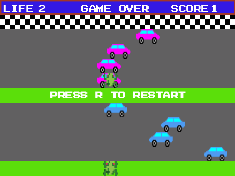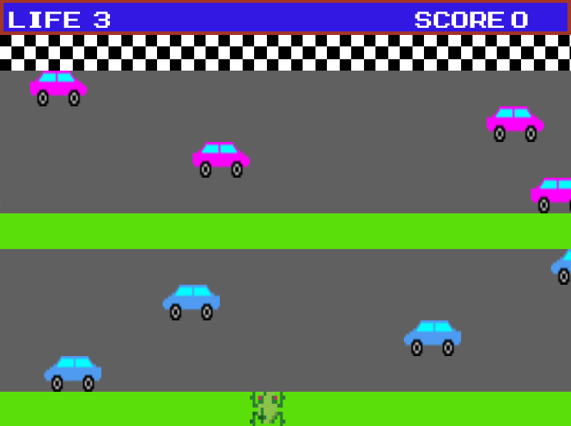 Vous incarnez une grenouille qui doit atteindre l'autre bout de la route. La difficulté est que des véhicules roulant à des vitesses aléatoires circulent sur la route.